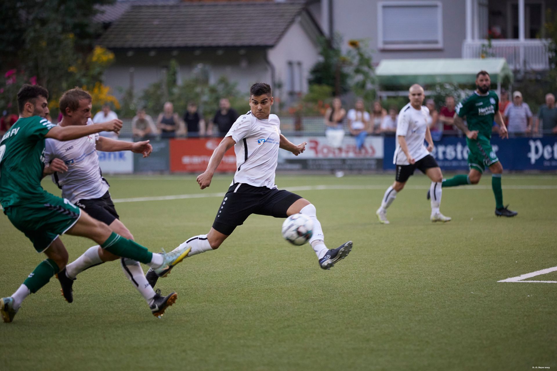 Gleich zu Beginn lag die Führung für die Hausherren in der Luft, doch Jonas Wolfs Knaller wurde in allerhöchster Not geblockt. Bei der ersten guten Kehler Chance ballerte Jeremy Stroh aus sieben Metern drüber. Auch die Fernschüsse von Pierre Venturini waren stets gefährlich. In Front gingen jedoch die Gastgeber. Ein tolles Solo veredelte Jonas Wolf mit einem Flachschuss zum 1:0 in der 13. Minute. Nur zwei Minuten später tankte sich Pirmin Bonath ähnlich durch, sein Versuch wurde jedoch in letzter Sekunde ans Außennetz abgefälscht. Dann wollten die Gäste einen Handelfmeter, der Unparteiische pfiff jedoch nicht. In der Folge parierte der starke Oberwolfacher Schlussmann Oliver Mai zweimal gegen Nicolas Rios und einmal gegen den eigenen Mann Lucas Schmid, dem beinahe ein Eigentor unterlaufen wäre. Insgesamt war der Kehler FV nun die klar bessere Mannschaft. Die Grenzstädter spielten schnell und technisch versiert nach vorne, vergaßen bis dato aber das Toreschießen. Auch Jeremy Stroh fand bei seinem Kopfball in Minute 37 in Keeper Mai seinen Meister. In der 40. Minute war es dann aber soweit: nach einem Doppelfehler von Tim Springmann legte Venturini quer und Jeremy Stroh schob zum 1:1 ein. Wenig später drehte der KFV die Partie sogar komplett. Elyes Bounatouf hatte zu viel Platz und traf mit der Pieke zur verdienten 2:1-Führung für Kehl ins linke Eck. Im Gegenzug hätte auch der SVO nach einem Zupfer an Lucas Schmid gerne einen Strafstoß gehabt, erneut blieb die Pfeife aber stumm. Die Kehler Führung zur Pause ging absolut in Ordnung.