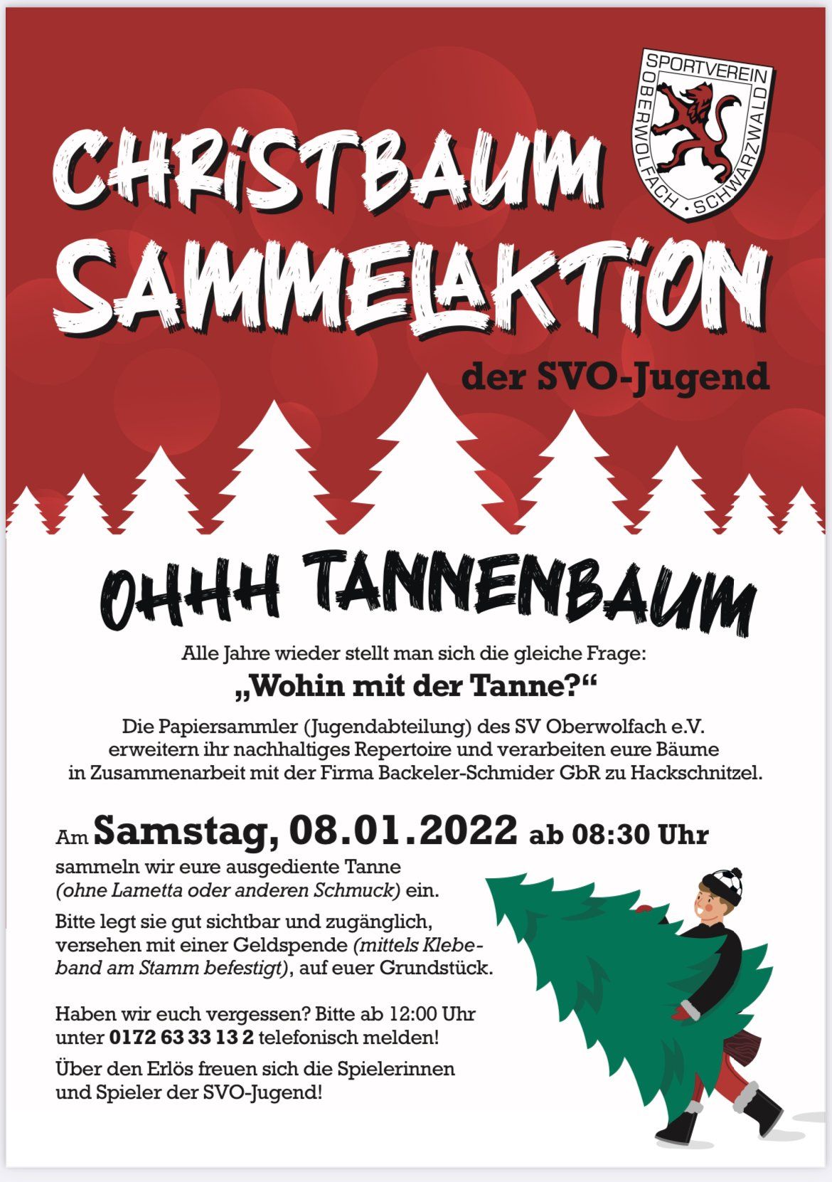 Alle Jahre wieder stellt sich die Frage: „Wohin mit dem Weihnachtsbaum, wenn dieser nach Dreikönige seine Dienste getan hat?“ Für alle Oberwolfacher liefert dieses Jahr erstmals der SVO die Antwort. Der Fußballverein sammelt am kommenden Samstag die alten Christbäume ein. Diese werden anschließend zu Hackschnitzeln verarbeitet. Der SVO trägt dadurch neben der regelmäßig durchgeführten Altpapiersammlung mit einer weiteren Aktion zum nachhaltigen Umgang mit natürlichen Ressourcen bei.