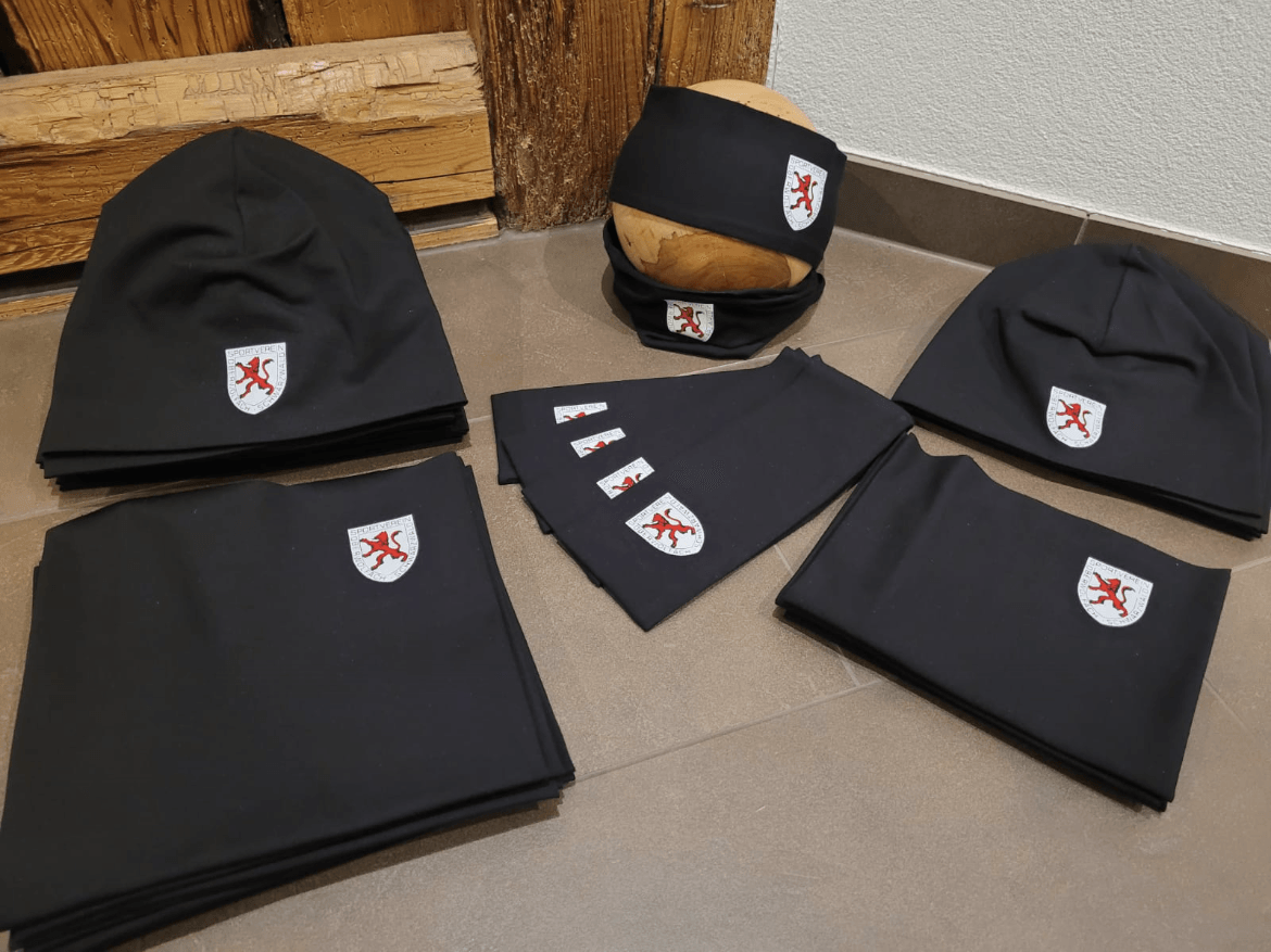 Balkenschal (15€), Basecap(15€), Armycap (15€), Bommelmütze (20€), Beanie Erw./Kinder (25€), Buff Erw./Finder (20€), Schirm (20€), Trinkflasche (10€), Vesperdose (10€), Aufkleber (1€)